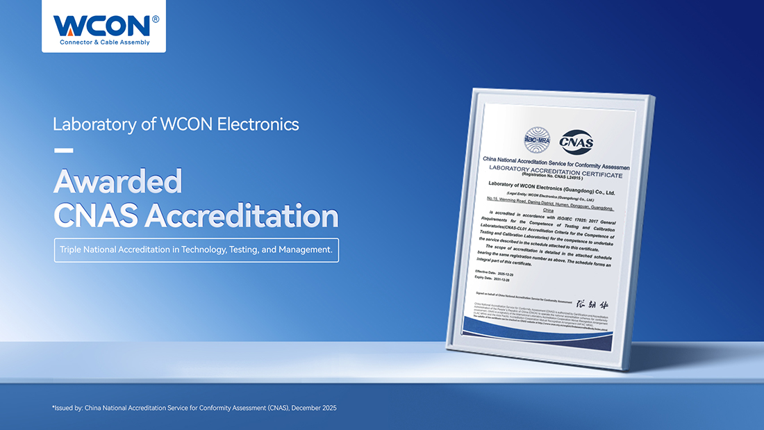 Le 29 décembre 2025, WCON Electronics Co., Ltd. a officiellement reçu le certificat d’accréditation de laboratoire CNAS décerné par le Service national d’accréditation chinois pour l’évaluation de la conformité (CNAS). Cela signifie que le centre d’essais et d’expérimentation créé indépendamment par WCON Electronics a obtenu une reconnaissance nationale pour ses capacités techniques, ses normes de gestion et la fiabilité de ses résultats d’essais, démontrant que son système de gestion de la qualité est désormais aligné avec les normes internationales.